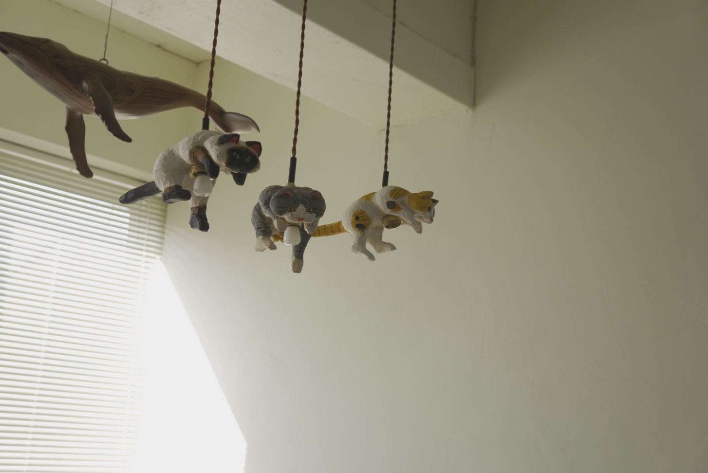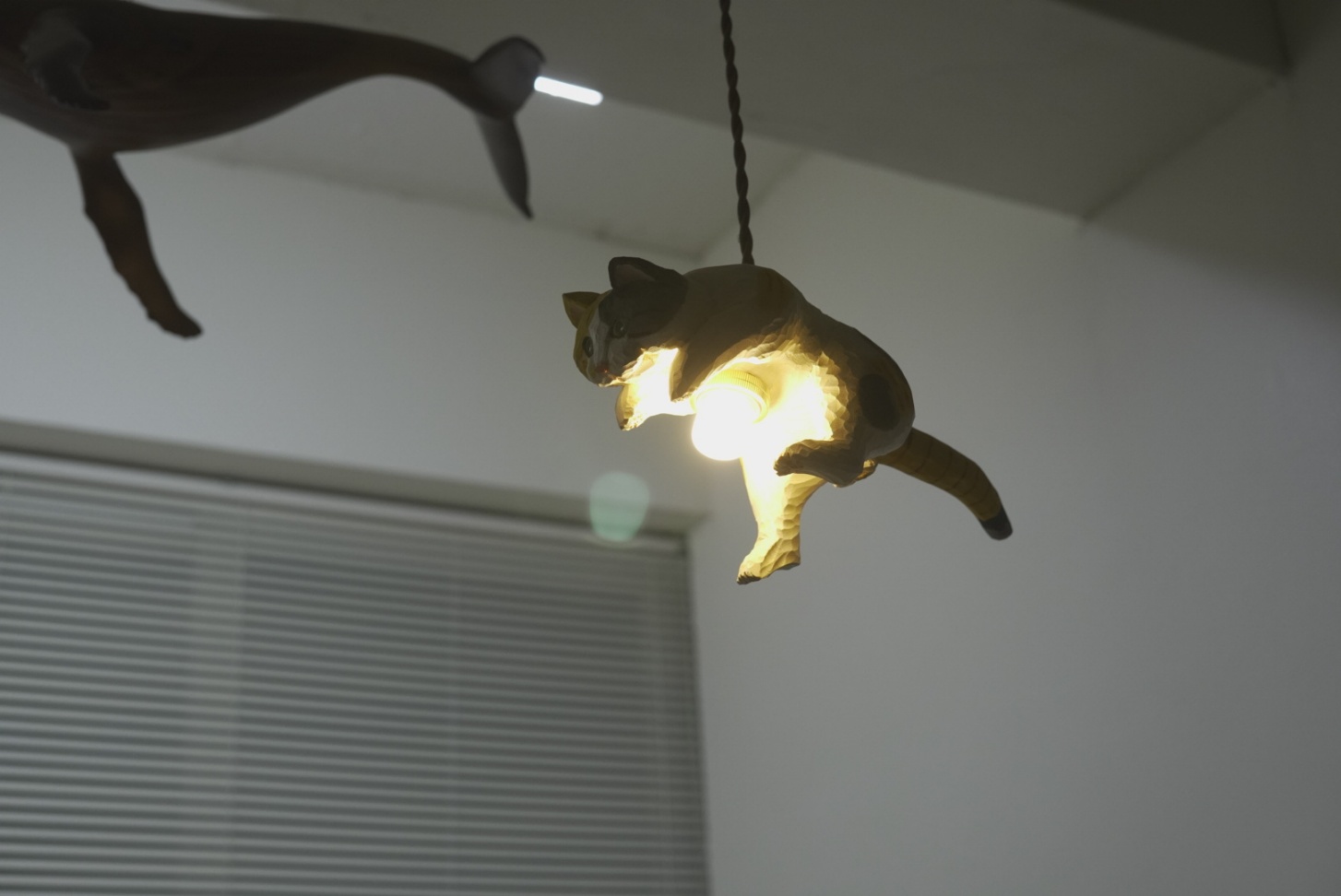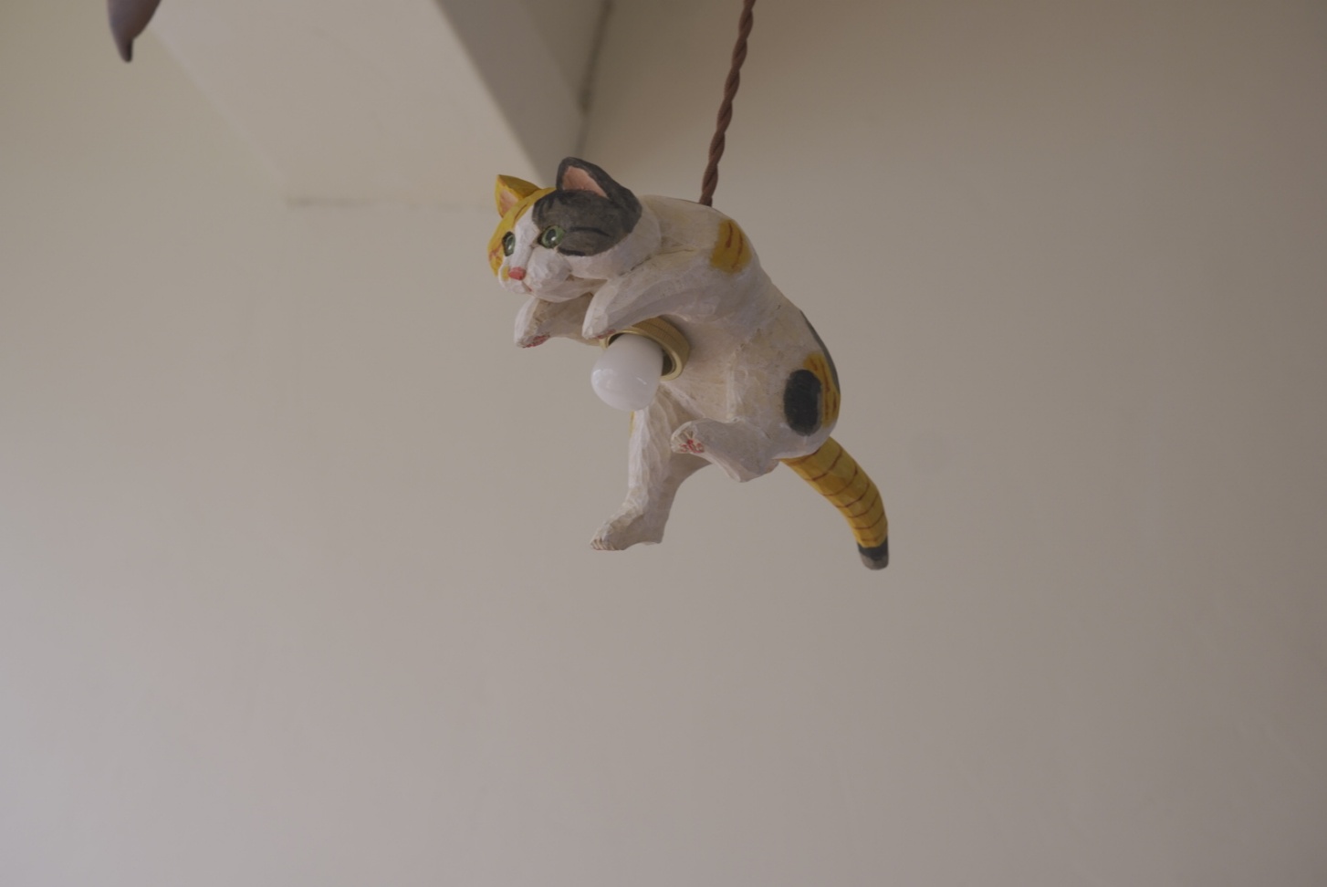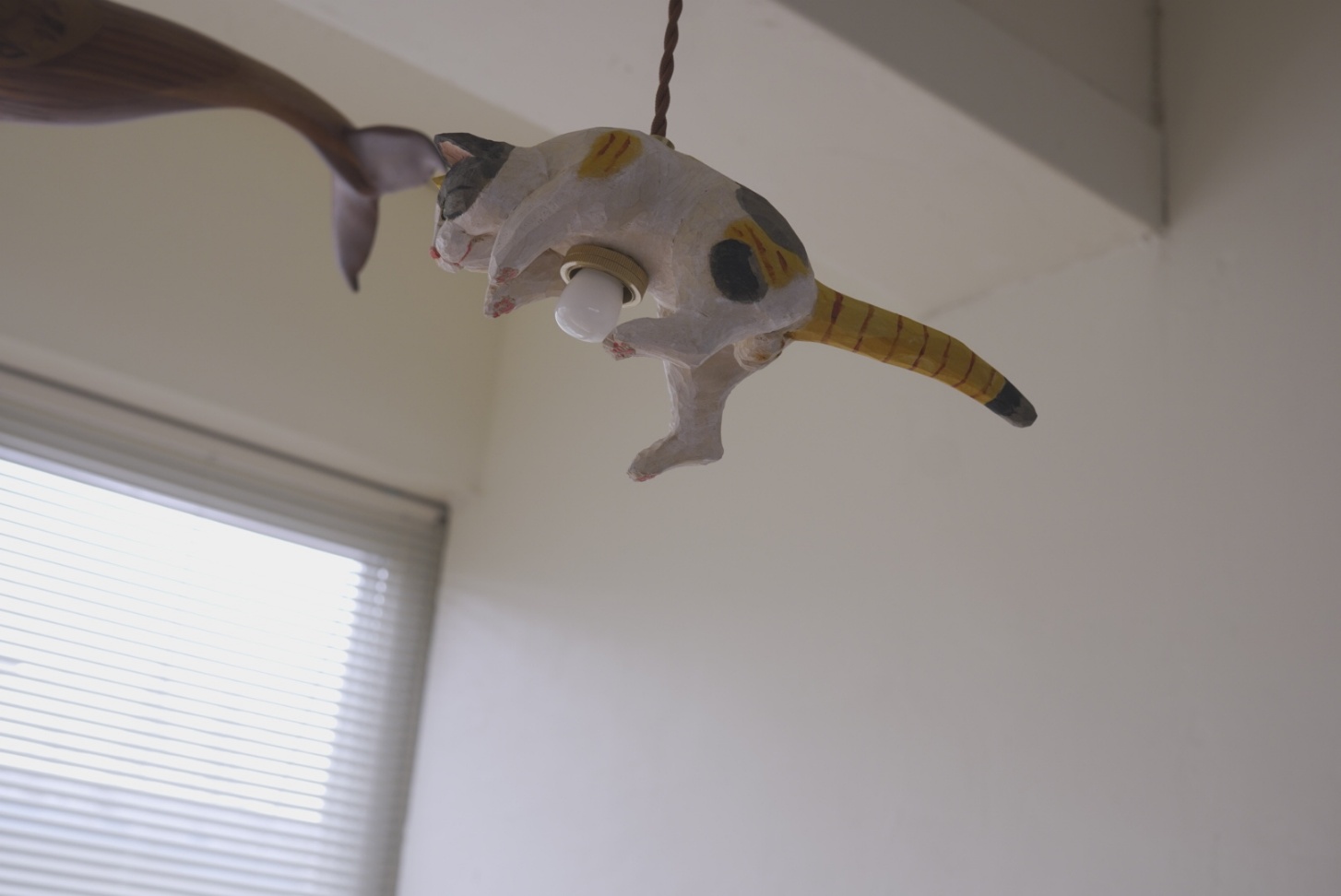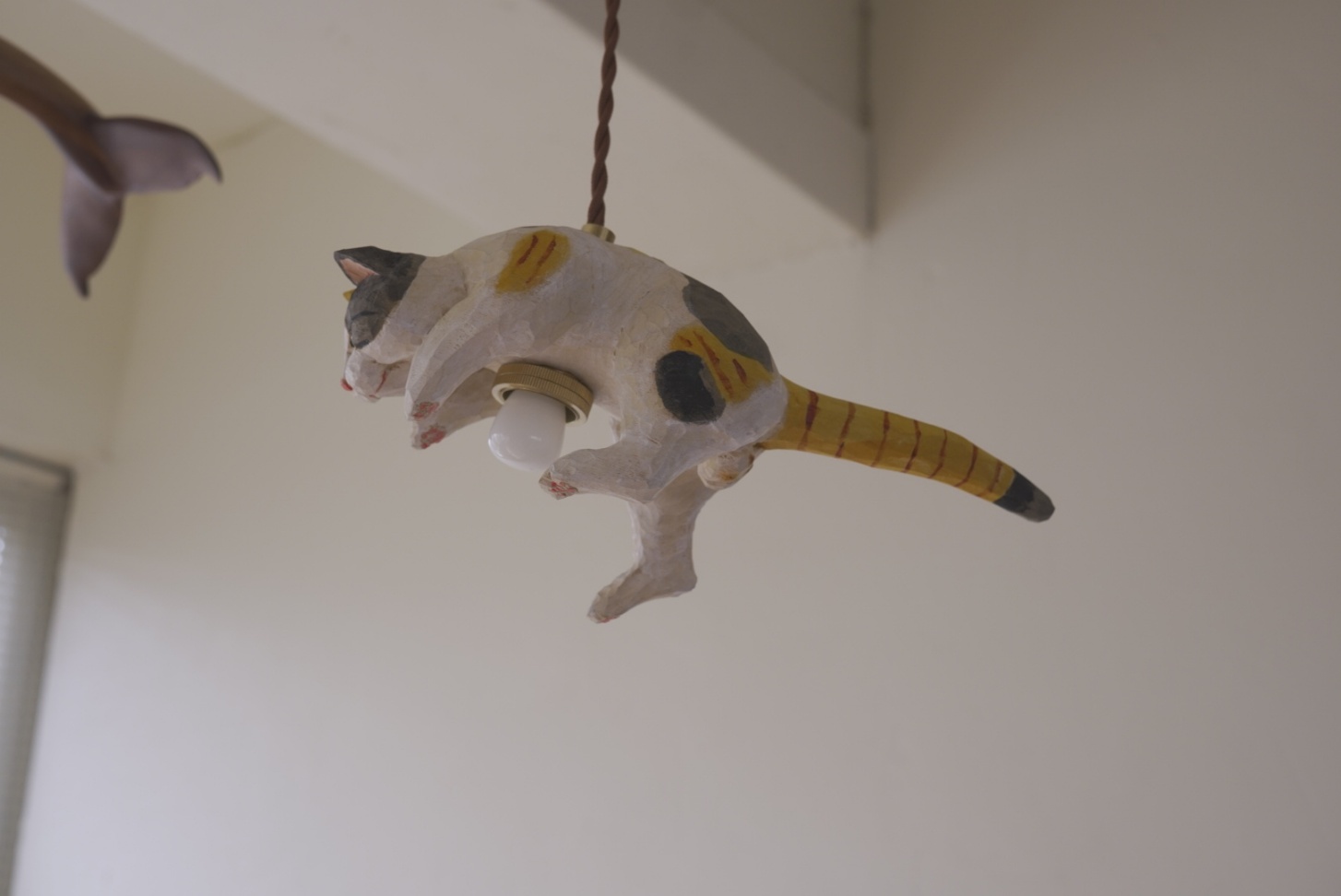 천장을 올려다보면, 나무로 정성스럽게 깎아 만든 고양이 한 마리가 마치 하늘을 향해 힘차게 점프하는 모습으로 떠 있습니다.