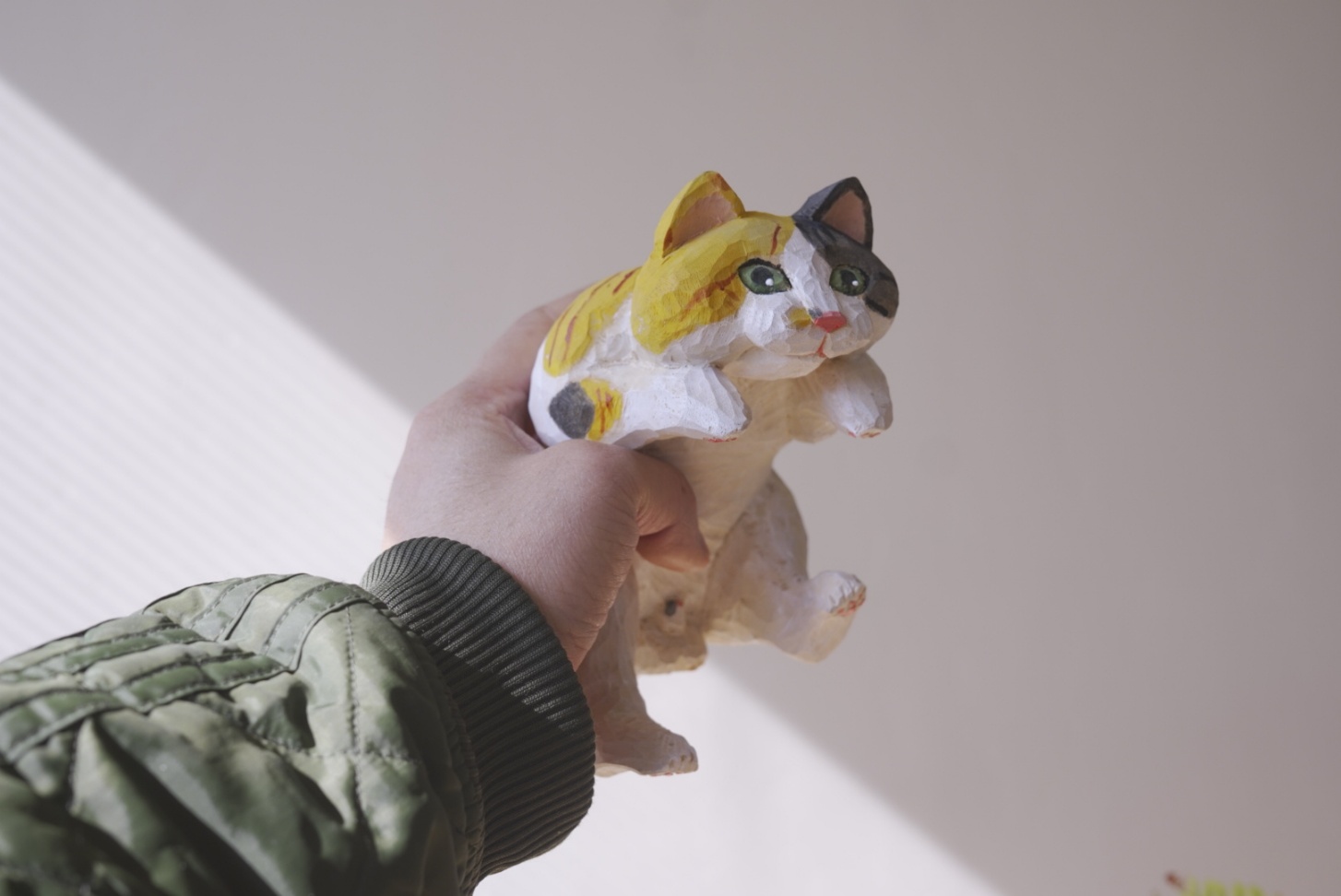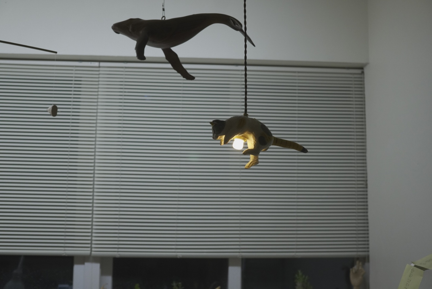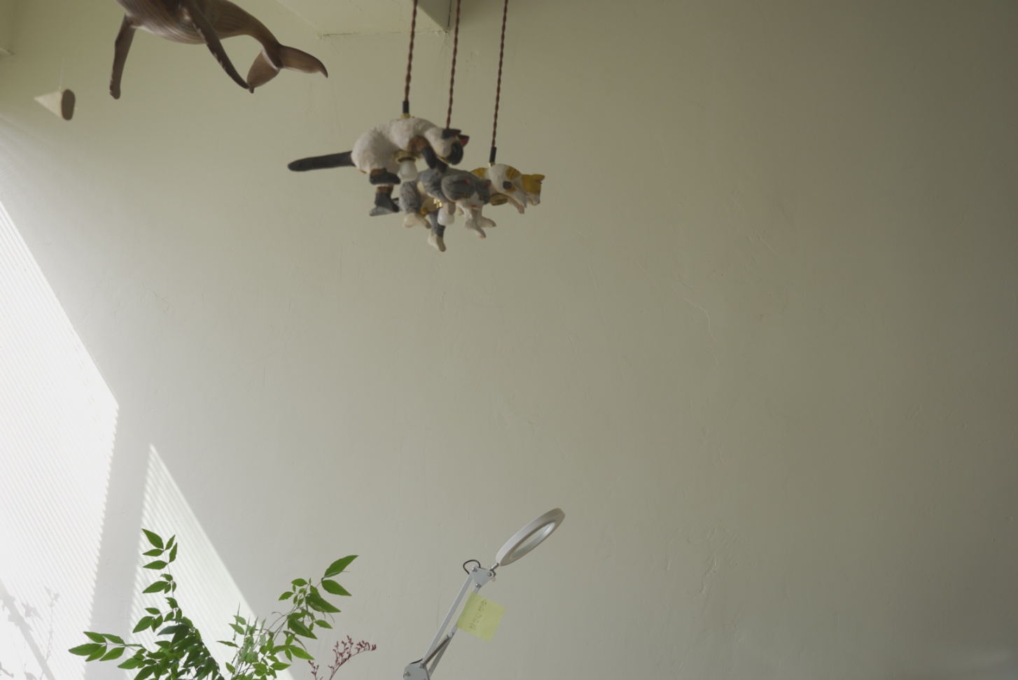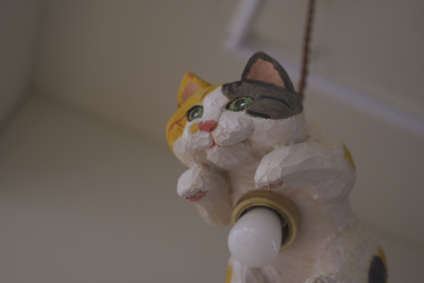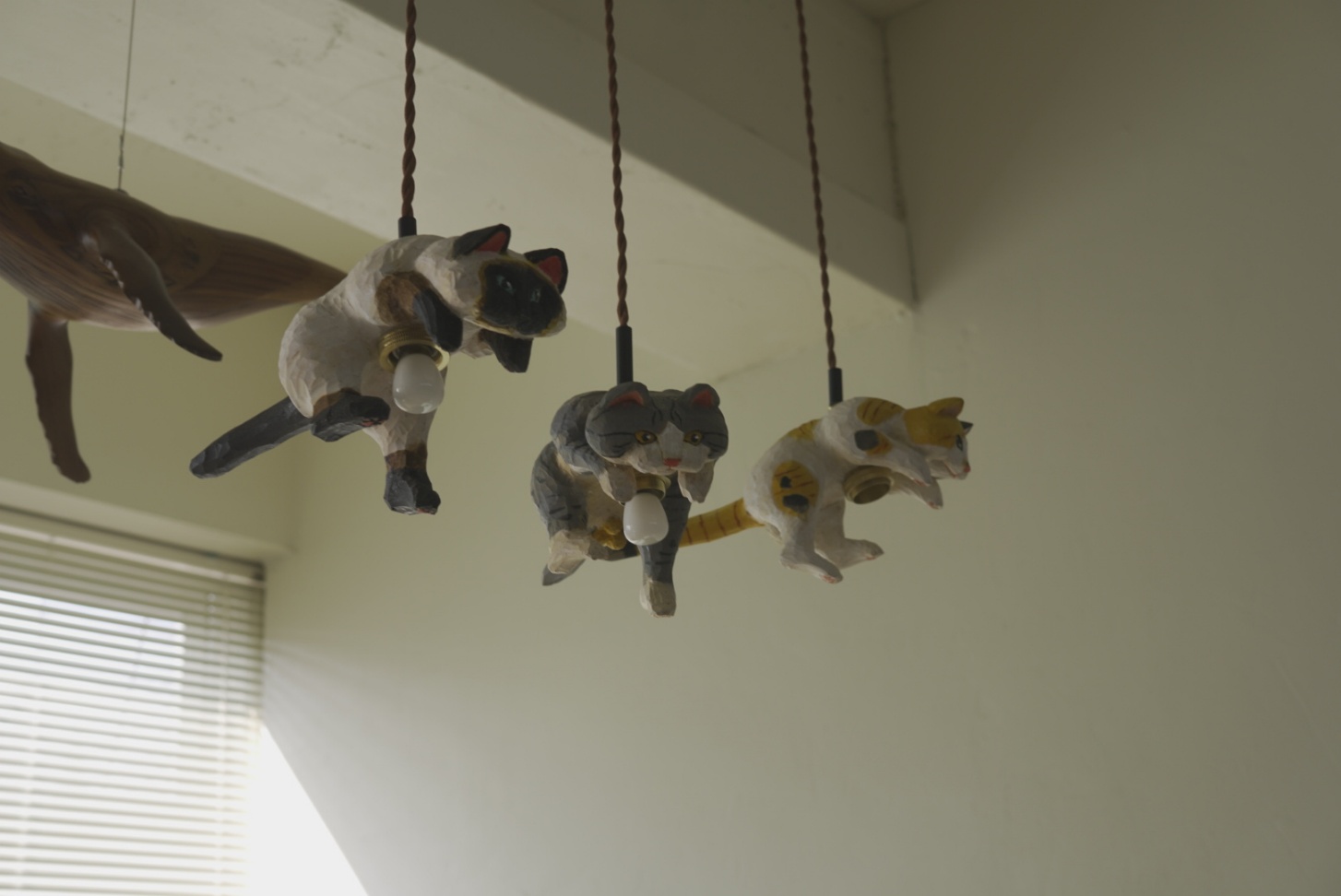 천장을 올려다보면, 나무로 정성스럽게 깎아 만든 고양이 한 마리가 마치 하늘을 향해 힘차게 점프하는 모습으로 떠 있습니다.